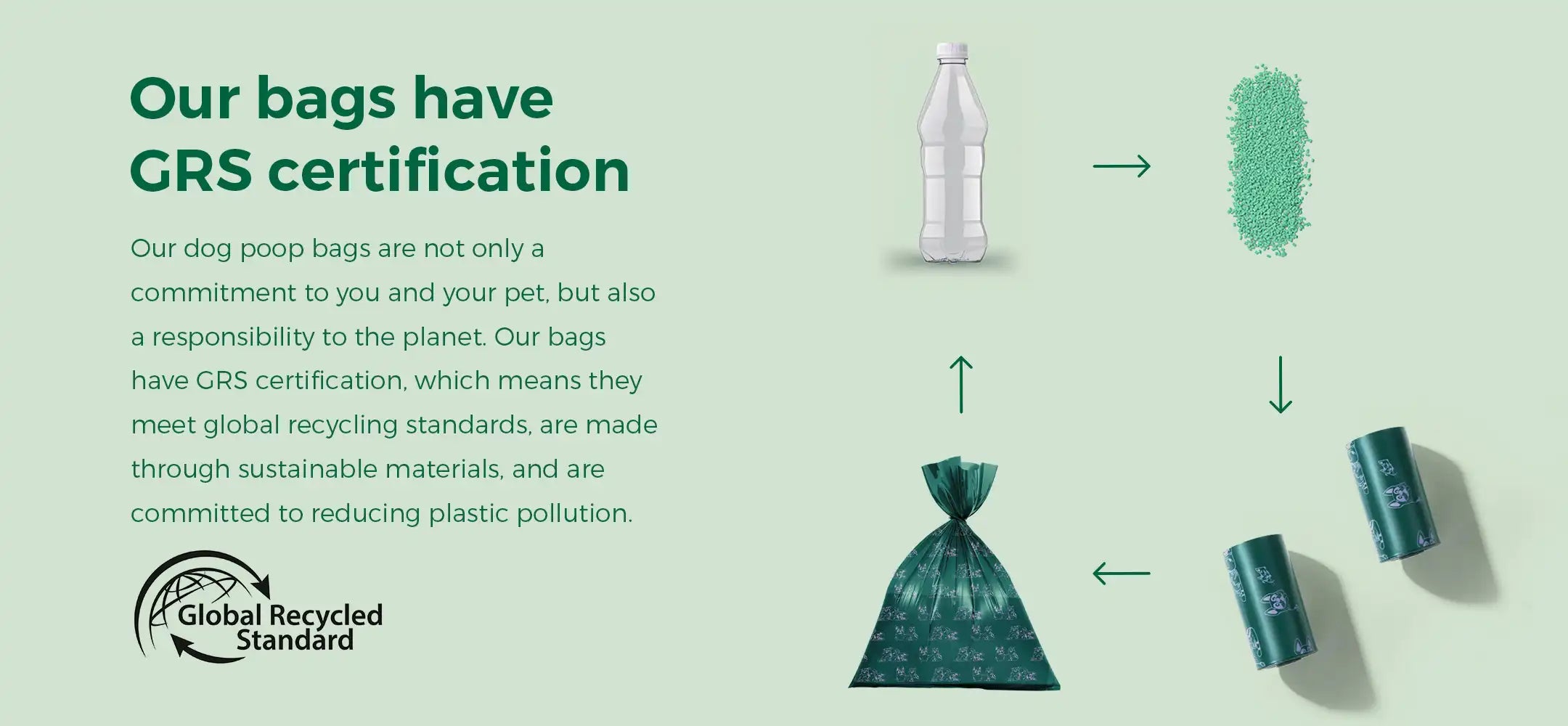 ♻️GRS Certificate: Made from 65% Recycled post-consumer polyethylene, these dog poop bags rolls give recycled plastic a second life.